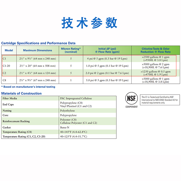 炭粉的二次研磨和湿铸融合炭纤维技术,更有效地提高了对余氯、异味和泥沙 等污染物的去除能力。 外部包裹的滤网,增加了强度和纳污能力。 提供各种尺寸大小的过滤精度为5微米活性炭滤芯。 低压力损失条件下,提供更较大的流量。 一般应用于住宅自来水过滤,和循环水处理系统的精滤。 温度范围:4.4-51.7?C。