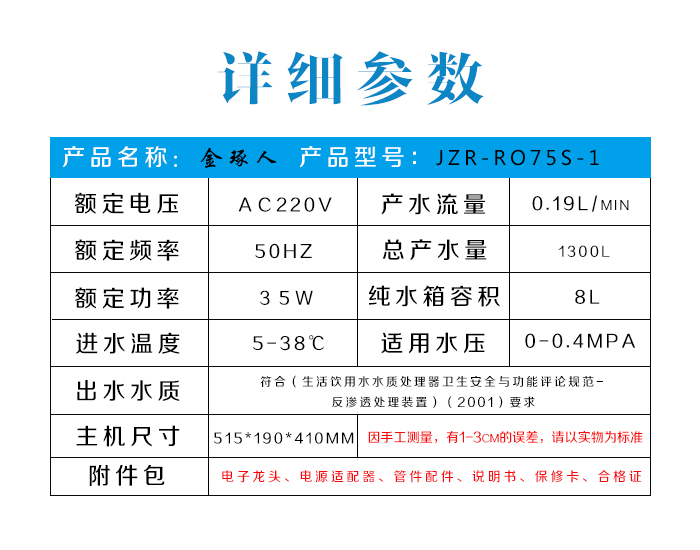 JZR-RO75S-1,高端净水器,金琢人过滤器,厨房家用纯水机,滨特尔滤芯