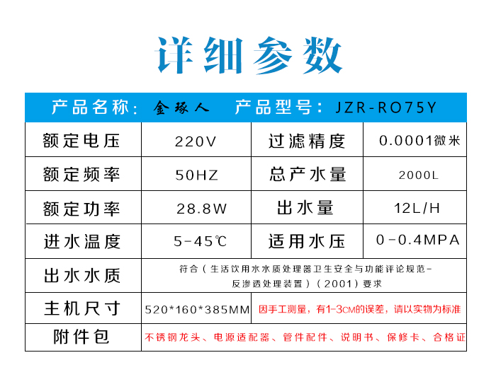 金琢人反渗透纯水机:JZR-RO75Y